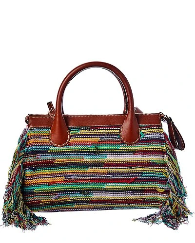 - Edith Day Medium Satchel in multicolor knit cotton and brown leather with gold-tone hardware, exterior pocket and fringe trim