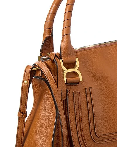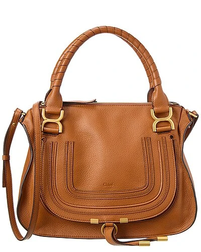- Marcie Medium Leather Satchel in brown leather with gold-tone hardware, embossed logo accent, exterior pocket and canvas lining