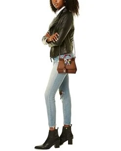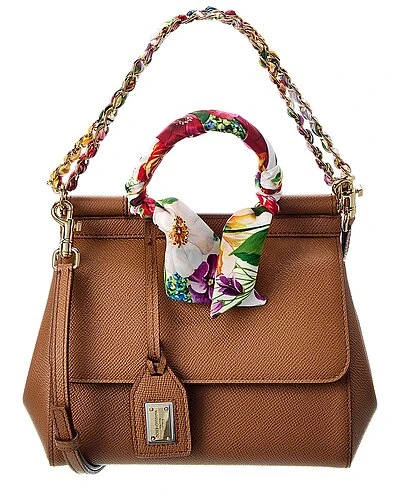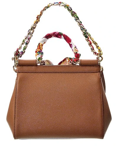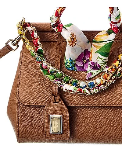 - Sicily Small Leather Satchel in brown leather and gold-tone hardware with logo detail and printed scarf accent