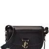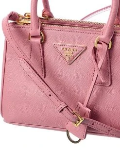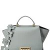 - Exterior design details: gold-plated hardware, metal lettering logo on leather triangle detail, detachable keyring