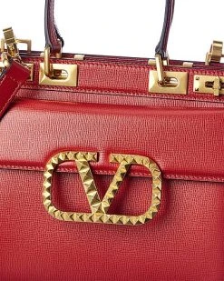 - Valentino Rockstud Alcove Medium Grainy Leather Satchel in red leather and gold-tone hardware with VLogo accent and exterior pocket